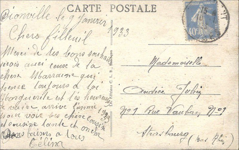 Postkarte von Bionville, einer französischen Gemeinde im Departement Meurthe-et-Moselle, vom 9. Januar 1933 nach Straßburg. Auf der Ansichtsseite ist die Roche de Faucompierre in der Nähe von Raon l'Etape zu sehen. Ich frage mich, ob das etwas mit dem Schloss Fucompierre zu tun hat. Im Inernet findet man nicht viel. Selbst auf Wikipedia heißt es, dass die Geschichte dieses Schlosses ziemlich unbekannt ist. Wer hätte vielleicht Informationen darüber? Vielen Dank im Voraus.